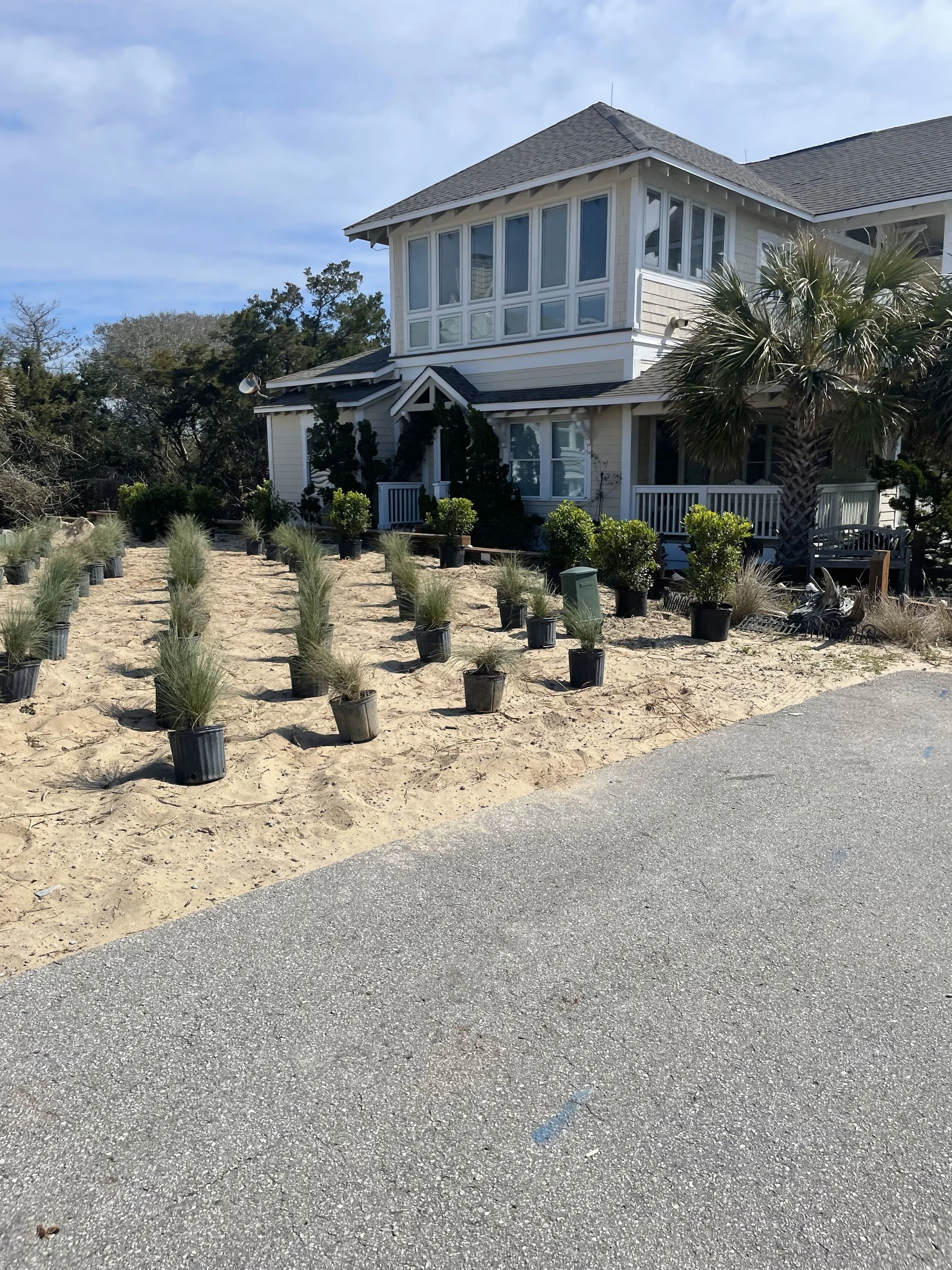 cobblestone walkway, stepping stones, a new fence, and native vegetation.